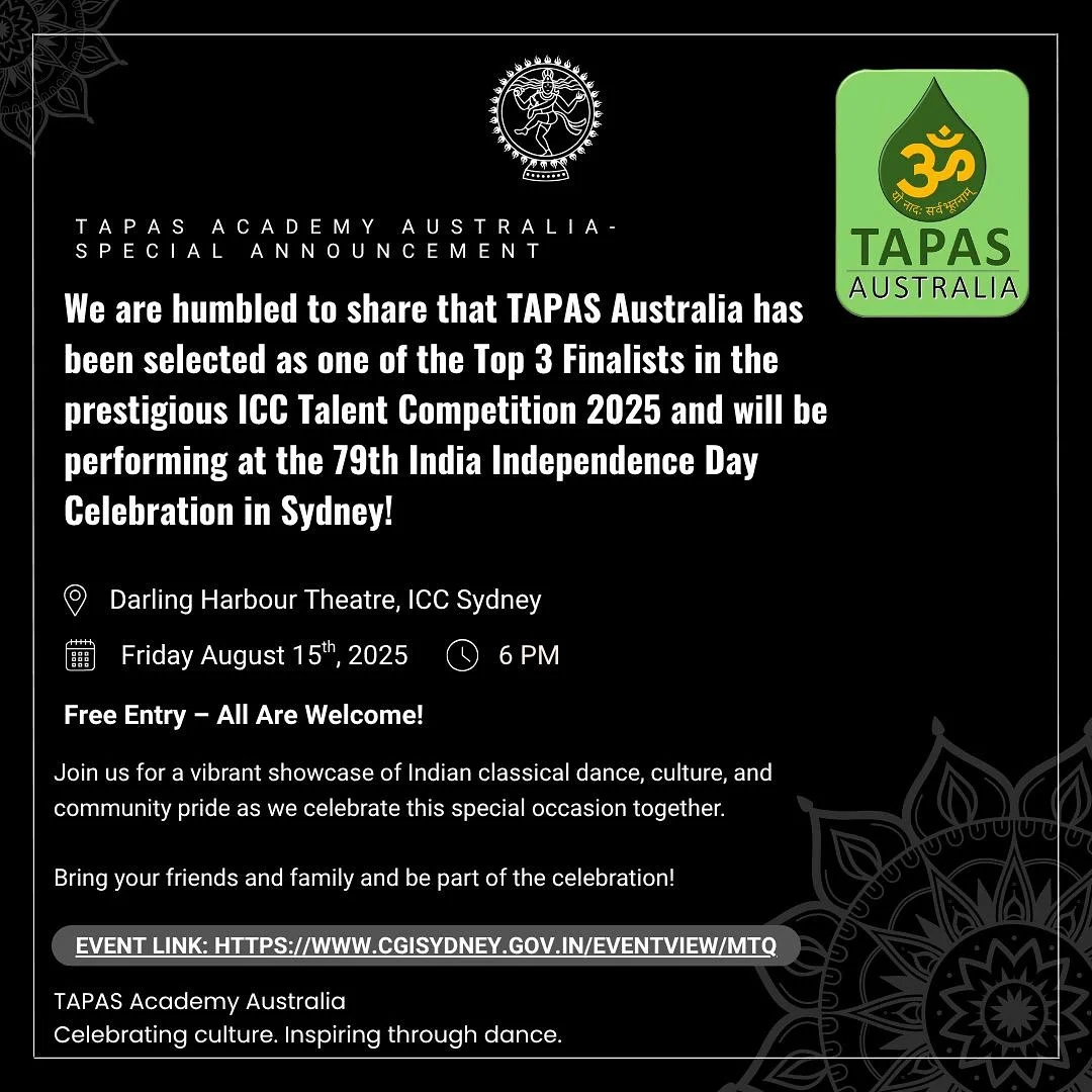 TAPAS Academy is a distinguished Bharathanatyam institution rooted in the Kalakshetra bani, founded by Acharya Smt. Mahalakshmi Ashwin in Chennai. With a strong pedagogical foundation, the academy has expanded internationally, with branches in Canada and Australia. TAPAS Australia, based in Castle Hill and Baulkham Hills, is led by Swapna R Shankar with the support and blessings of her Guru, Smt. Mahalakshmi.
